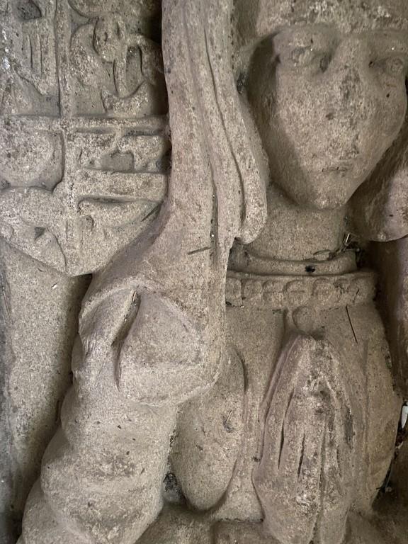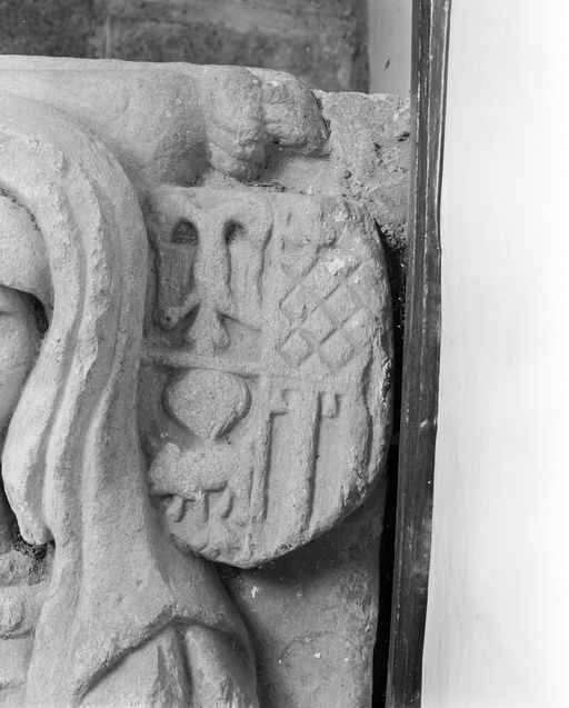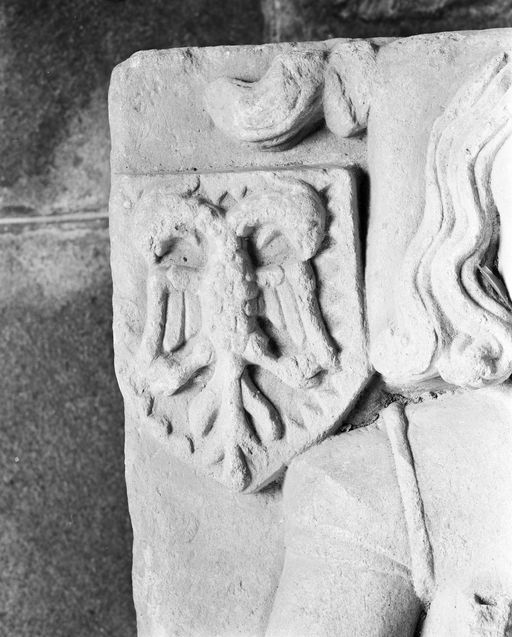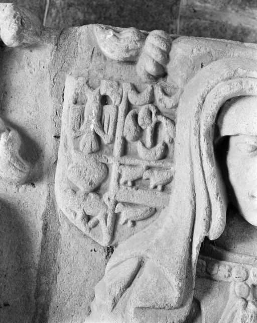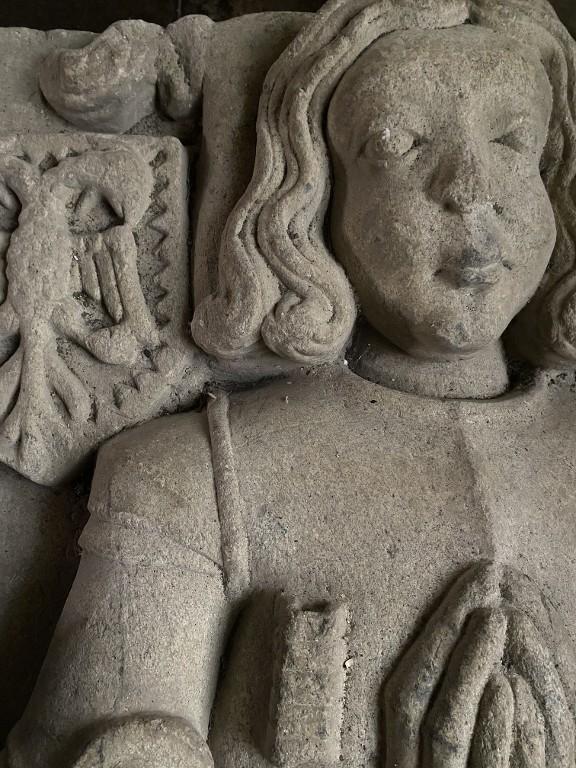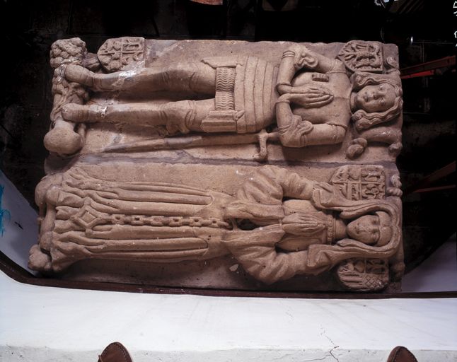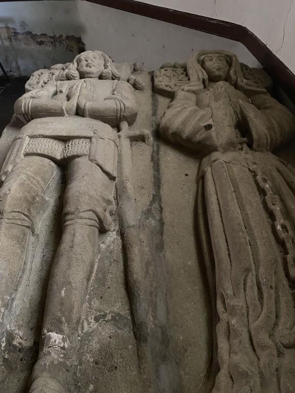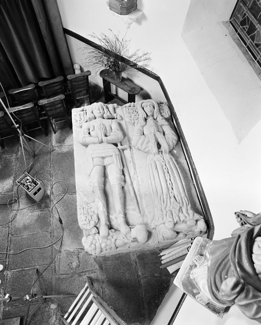 Montées sur un soubassement en maçonnerie dans le bras nord du transept, ces dalles jumelles représentent les gisants d'un couple Herbaut-Quelen, seigneurs du Broutay, dont le manoir est aujourd'hui réduit à l'état de vestige. Ces deux familles sont alliées depuis le milieu du XIVe siècle et, si on reconnaît aisément l’aigle à deux têtes des Herbaut, les alliances figurées sur les autres écus ne sont pas identifiées.