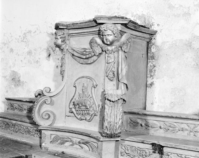 Autel à élévation galbée dont le devant est orné du Triangle trinitaire dans une nuée, et les angles d'angelots. Le décor du tabernacle est constitué d'un Agneau aux sept sceaux (porte) et de deux ailerons à volute posés sur les angles antérieurs et surmontés de deux angelots.
