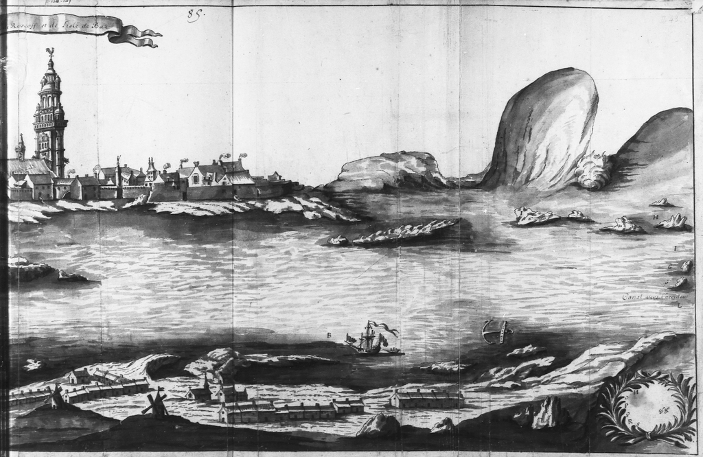 Reproduction - Vue cavalière de Roscoff et de l'Île de Batz, partie ouest, 1750, coll. Robien.Immatriculation