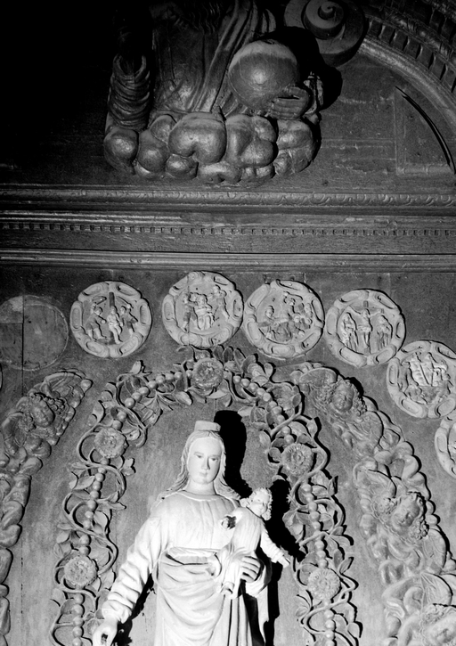 Groupe sculpté, bas-reliefs (14) (d'applique, petite nature) : la donation du Rosaire, église paroissiale Saint Pierre (Maël-Carhaix),