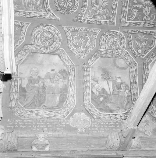 Oratoire, voûte lambrissée peinte : panneau V, sainte Noyale portant sa tête, panneau VI : sainte Noyale dans un bois.Immatriculation