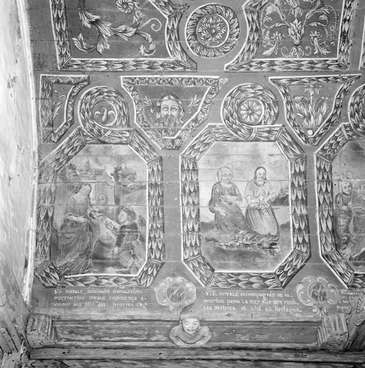 Voûte lambrissée peinte : panneau I sainte Noyale et les pauvres, panneau II sainte Noyale passe en Bretagne.Immatriculation