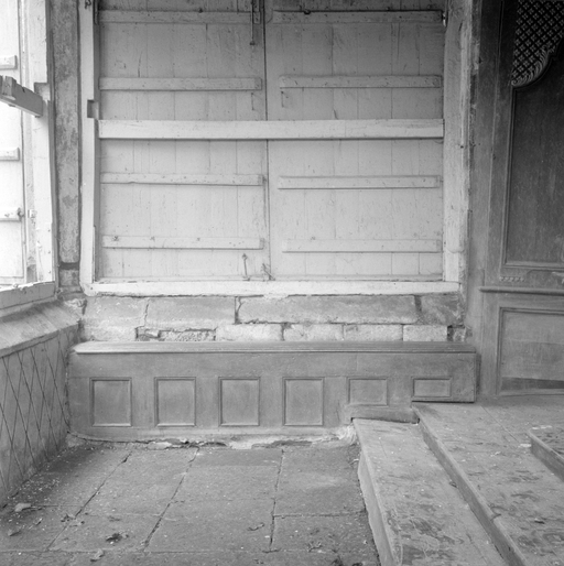 Oratoire : banc de bois contre le mur nord.Immatriculation