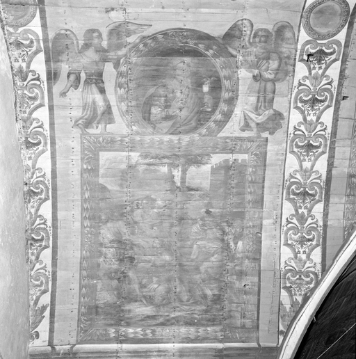 Voûte lambrissée peinte, bras sud du transept, panneau ouest : le Portement de croix.Immatriculation