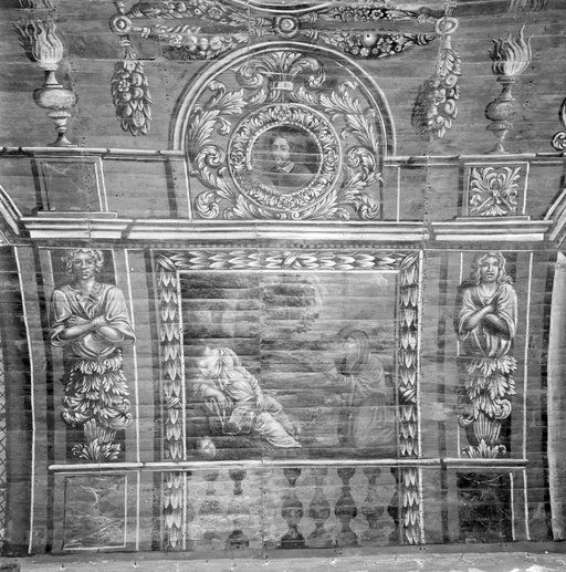 Voûte lambrissée peinte, nef, panneau VIII au sud-est : la mort de sainte Noyale.Immatriculation