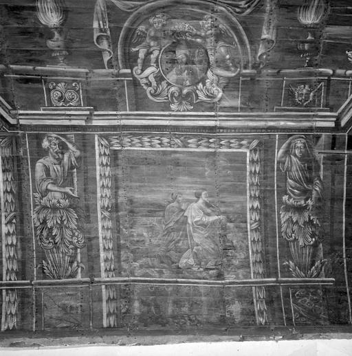 Voûte lambrissée peinte, nef, panneau 3 au nord, au centre : sainte Noyale passant en Bretagne.Immatriculation