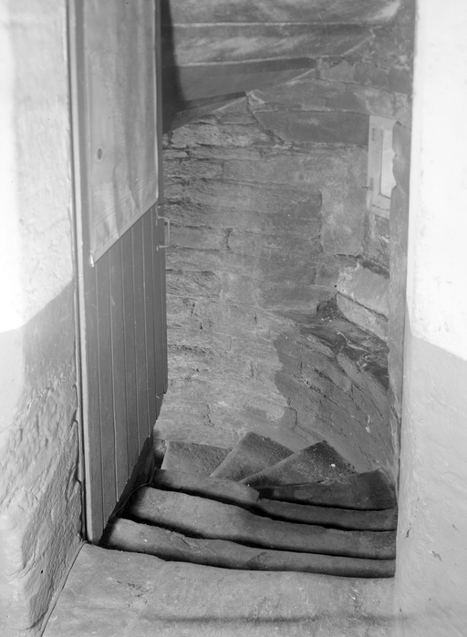 Maisons A et B, intérieur de la tourelle d'escalier : degrés descendant à la cave.Immatriculation