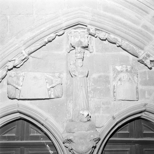 Vierge à l'Enfant et panneau sculpté sous le porche sud.Immatriculation