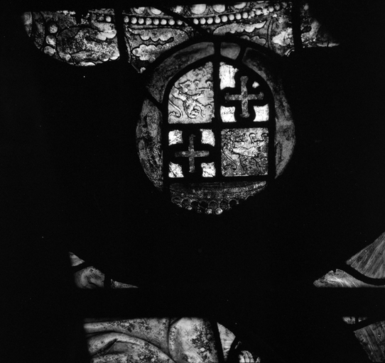 Vitrail du mur nord du bras nord du transept, blason centre-droit.Immatriculation