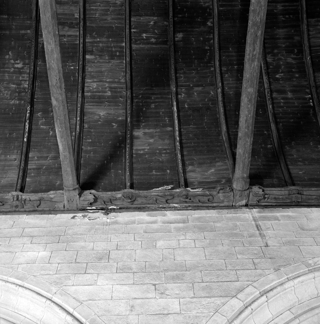 Sablières, détail du mur nord de la nef, entre entraits 5 et 6.Immatriculation