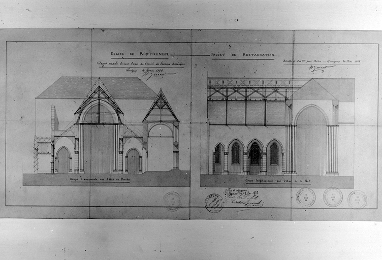 Projet de restauration : coupe sud-nord dans la nef, et coupe ouest-est dans la nef et le transept, 20 mai 1885, corrigé le 10 février 1886Immatriculation