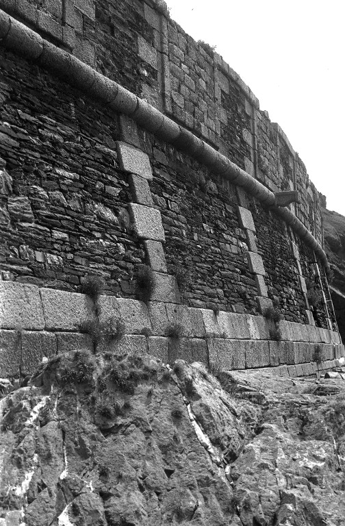 Vue de l'escarpe et du parapet (état en 1967). Marquant la jonction entre l'escarpe et le parapet, le cordon en granite. Les embrasures bouchées témoignent de l'évolution de l'armementImmatriculation