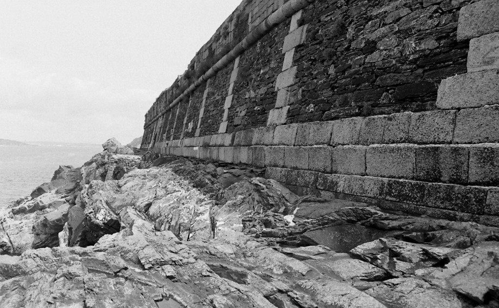 Vue de l'escarpe et du parapet (état en 1967). Marquant la jonction entre l'escarpe et le parapet, le cordon en granite. Les embrasures bouchées témoignent de l'évolution de l'armementImmatriculation