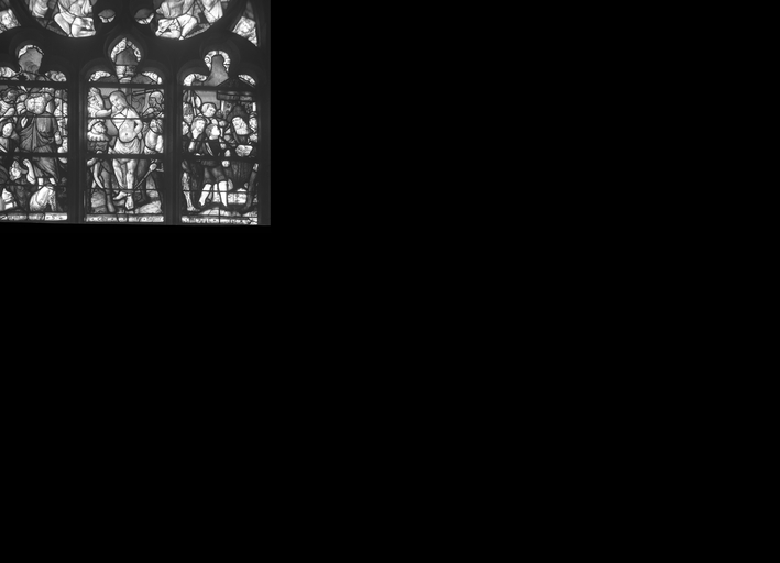 Vitrail du mur sud du bras sud du transept : panneaux supérieurs : 1. baiser de Judas ; 2. Flagellation ; 3. JugementImmatriculation
