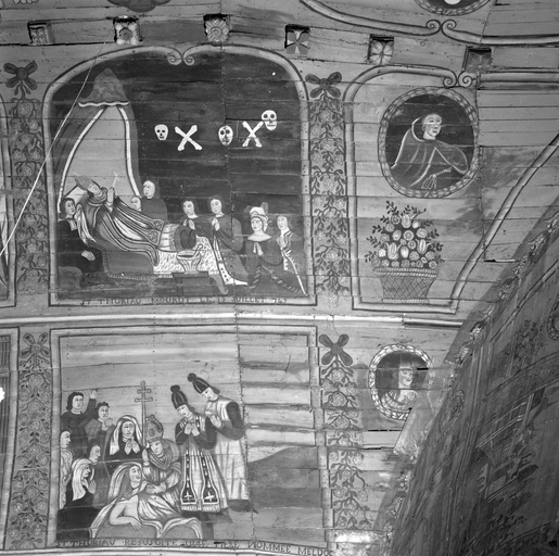 Lambris peint de la voûte, bars sud du transept, à l'ouest : panneau 15, saint-Thuriau ressuscite Meldoc ; panneau 15, mort de saint-ThuriauImmatriculation