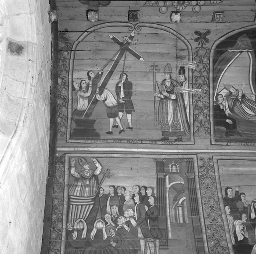 Lambris peint de la voûte, bras sud du transept à l'ouest : panneau 16, saint-Thuriau prêchant ; panneau 17, saint-Thuriau élève une croixImmatriculation
