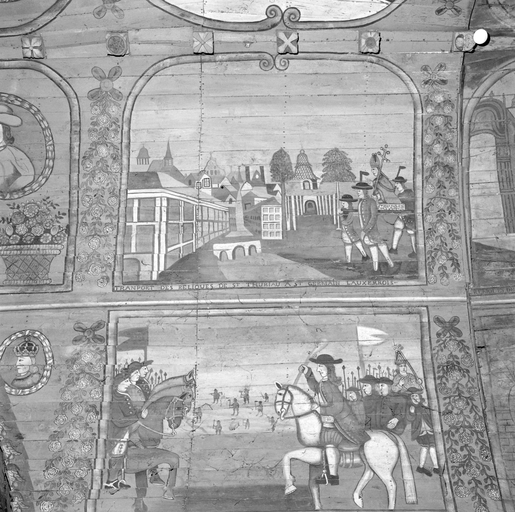 Lambris peint de la voûte, nef, au sud : panneau 19, transport des reliques ; panneau 20, guerre des bretons et des normandsImmatriculation
