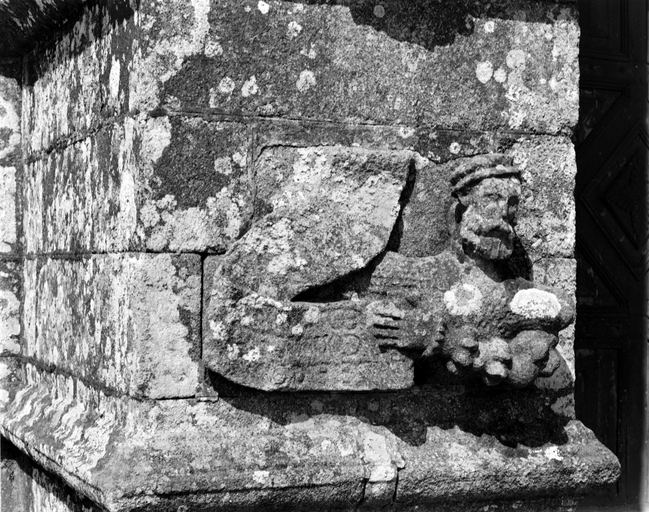Façade ouest, détail (figurine sculptée à la base du contrefort sud)Immatriculation