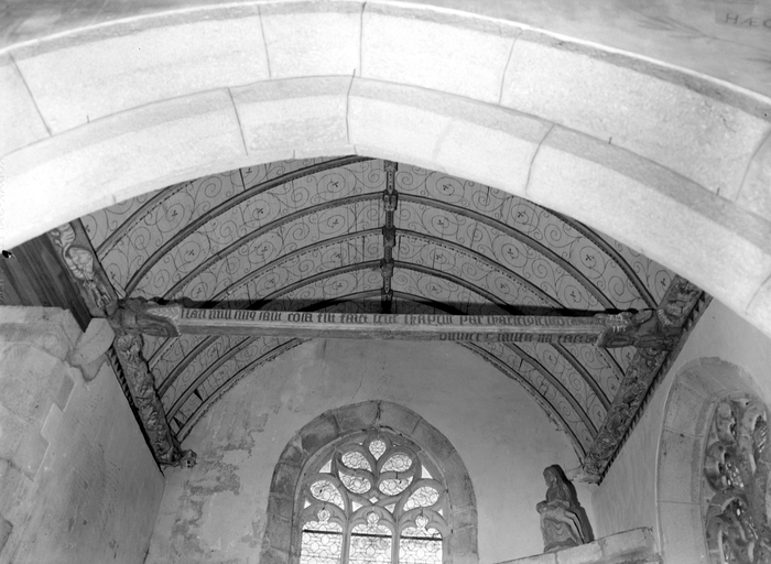 Ensemble de l'entrait engoulé portant l'inscription peinte, du bras nord du transeptImmatriculation