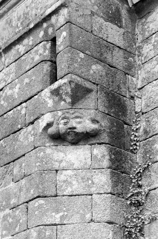 Tourelle d'escalier du porche, détail : vue de la tête sculptée à l'angle sud ouestImmatriculation