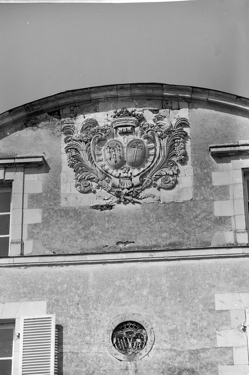 Vue de détail du grand blason, face est.Immatriculation