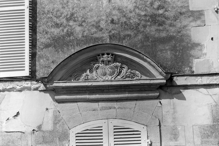 Vue de détail du petit blason (fronton du rez-de-chaussée), face est.Immatriculation
