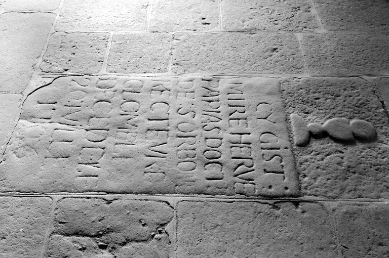 Nef, nord ouest : détail de la pierre tombaleImmatriculation