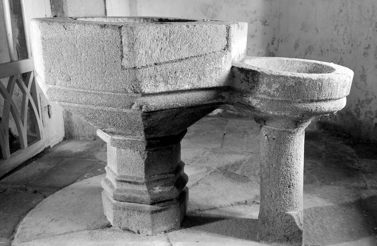 Fonts baptismaux (cuve baptismale à infusion), église paroissiale Saint Corentin (Glomel),