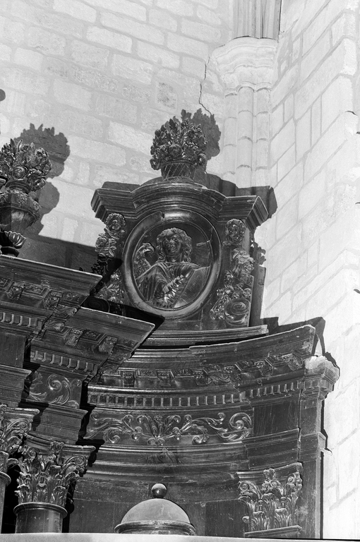 Croisillon sud, mur est, retable : fronton, détail du médaillon sud : saint L'EvangélisteImmatriculation