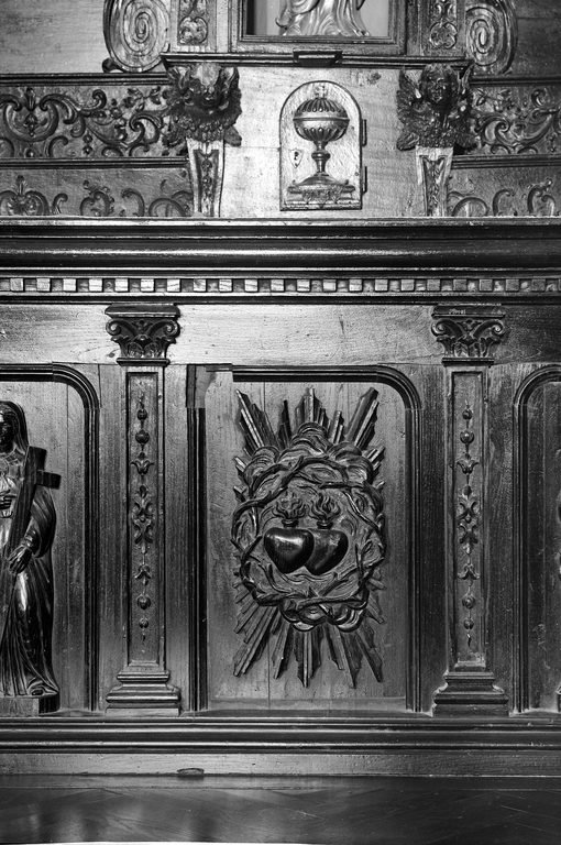 Autel (autel secondaire, autel tombeau), retable (retable architecturé), tabernacle, gradin d'autel, clôture d'autel, église paroissiale Notre-Dame du Roncier (Rostrenen),