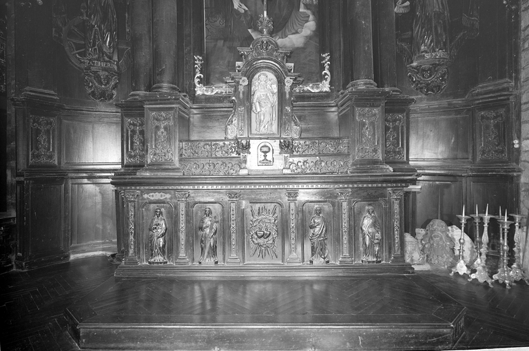 Autel (autel secondaire, autel tombeau), retable (retable architecturé), tabernacle, gradin d'autel, clôture d'autel, église paroissiale Notre-Dame du Roncier (Rostrenen),