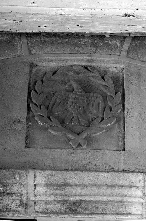 Corps de bâtiment ancien, rez-de-chaussée, pièce sud ouest, mur sud : détail du linteau de la cheminée : blason sculptéImmatriculation