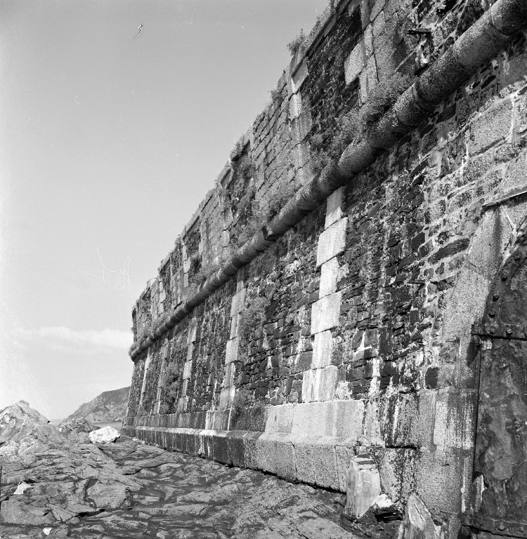 Vue de l'escarpe et du parapet près du poste de projecteur (état en 1969). Marquant la jonction entre l'escarpe et le parapet, le cordon en granite. Les embrasures bouchées témoignent de l'évolution de l'armementImmatriculation