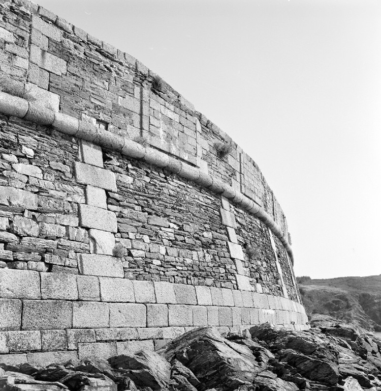 Vue de l'escarpe et du parapet (état en 1969). Marquant la jonction entre l'escarpe et le parapet, le cordon en granite. Les embrasures bouchées témoignent de l'évolution de l'armementImmatriculation