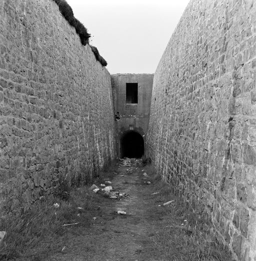 Vue de la batterie de Kerbonn en 1969 : branche sud du fossé de gorge. La porte du magasin à poudre sous roc est en arc plein cintre avec entourage harpé imitant la pierre de taille : il est daté de 1891 (date portée)Immatriculation