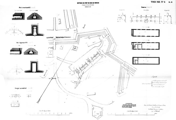 Plan et coupes de la batterie du fort de mer (4 canons de 19 cm), Direction d'Artillerie du génie de Brest, 1893, par le colonel Directeur d'Artillerie : CollombImmatriculation