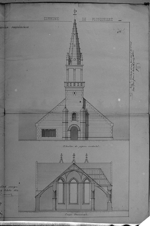 Dossier de restauration établi en 1884 par l'architecte Le Guerranic, planche datée du 29 octobre : détail de la coupe transversale et de l'élévation ouestImmatriculation