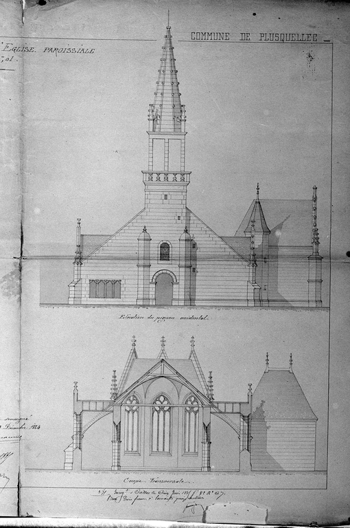 Dossier de restauration établi en 1884 par l'architecte Le Guerranic, planche datée du 13 décembre : détail de la coupe et de l'élévation ouest (à droite)Immatriculation