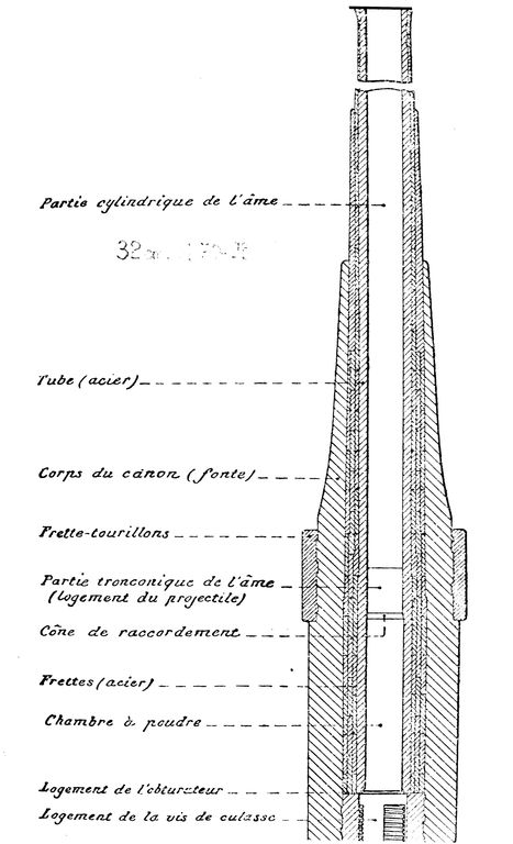 Coupe d'un canon de 32 cm modèle 1870-1893 (armement des batteries du Minou et des Capucins sur affûts M modèle 1882 PA)Immatriculation