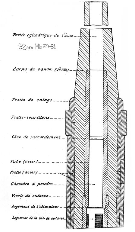 Coupe d'un canon de 32 cm modèle 1870-1881 (armement de la plupart des batteries de la rade de Brest sur affûts M modèle 1882 PA)Immatriculation