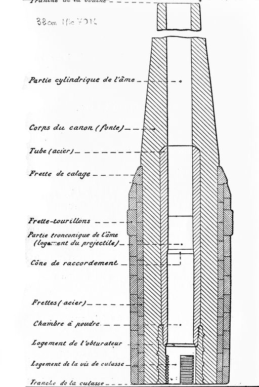 Coupe d'un canon de 32 cm modèle 1870 M (armement des batteries de Sept, du bastion n° 26, du fort de l'Armorique et de la pointe des Espagnols sur affût modèle 1876-T-83 PA)Immatriculation