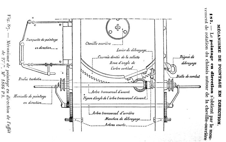 Plan détaillé du mécanisme de pointage en direction d'un affût modèle 1886 PA pour canon de 27 cmImmatriculation