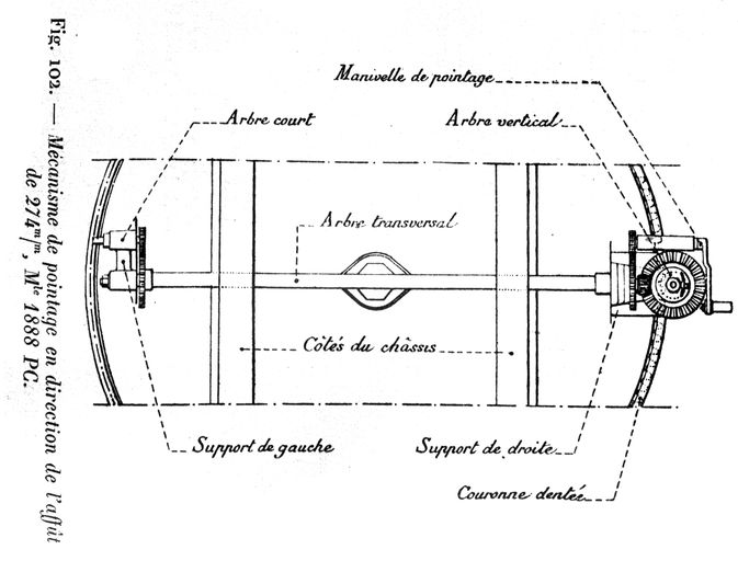 Plan détaillé du mécanisme de pointage en direction de l'affût modèle 1888 pour canon de 274 mmImmatriculation