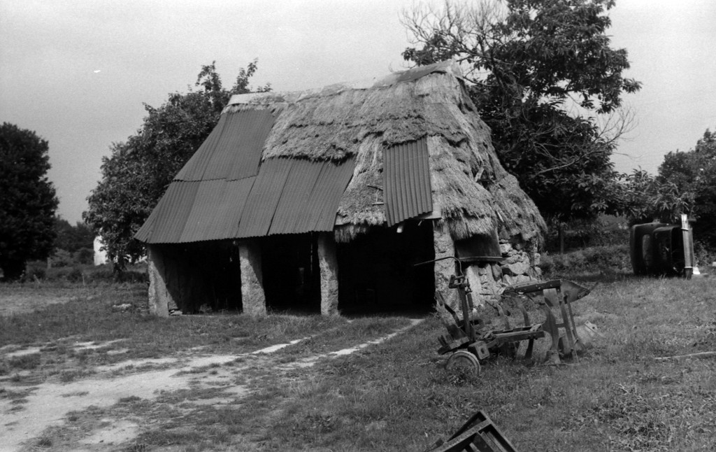 Vue d'ensemble d'une remise agricole sur piliers de granit faisant référence à la technique constructive en orthostatesImmatriculation