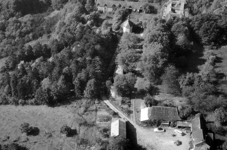 Vue aérienne vers l'ouest, château et ferme.Immatriculation