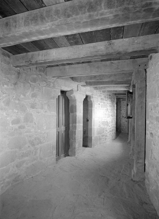 Vue du chemin de ronde : portes géminées à linteaux sur coussinets (état en 1974). Celle de gauche donne dans la salle haute du deuxième étage (via un tambour de porte) ; celle de droite dessert le corps de garde avec cheminéeImmatriculation