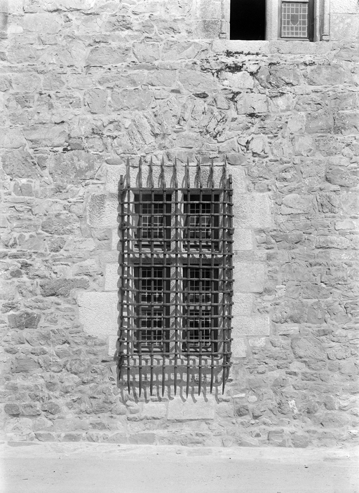 Vue depuis le sud-ouest : détail de l'élévation antérieure, salle basse, fenêtre grillée du rez-de-chaussée (état en 1974)Immatriculation