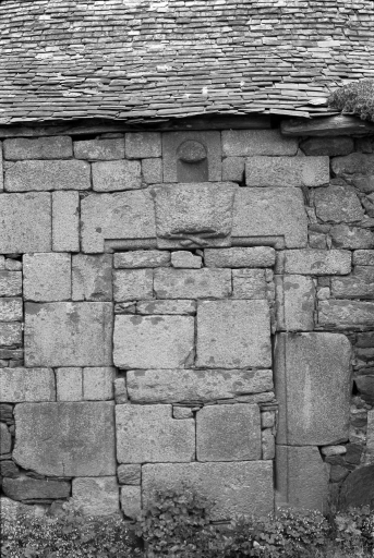 Hellegoat Braz. Vestiges de l'ancien manoir du Hellegoat, 1660, remontés début 19e siècle. Détail de la porte du logis avec les armes des Du Parc. Etat 1974Immatriculation