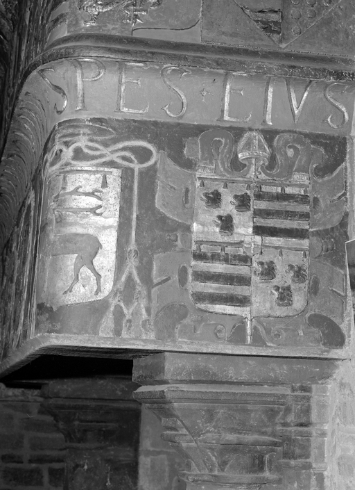 Tour sud-ouest, deuxième niveau - Cheminée, côté droit du linteau, détail d'un blason.Immatriculation