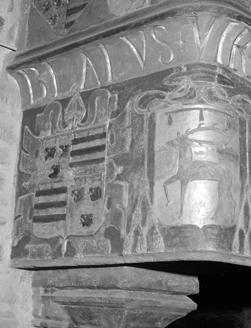 Tour sud-ouest, deuxième niveau - Cheminée, côté gauche du linteau, détail d'un blason.Immatriculation